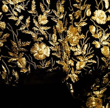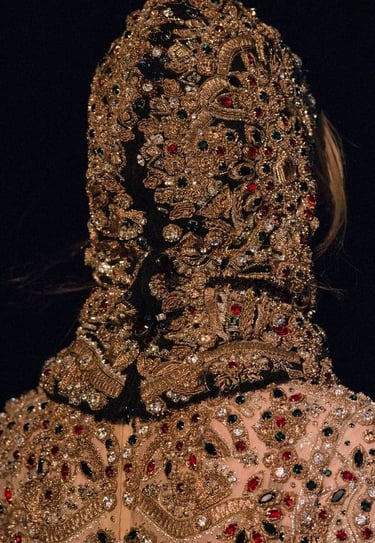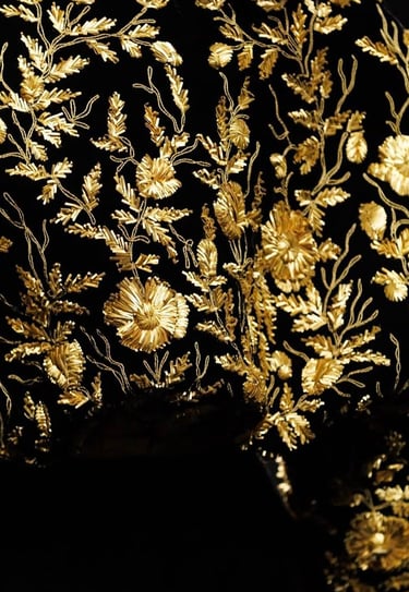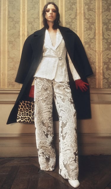 Patterns also play a vital role: arabesques, floral embroidery, golden embellishments… These details recall the frescoes and tapestries of palaces from the past. Today, we find them on jacquard jackets, printed scarves, or embroidered dresses, adding an effortless touch of opulence. Embroidery remains one of the most striking elements, often enhanced with shimmering sequins, gold threads, silk stitching, and delicate pearls. These embellishments catch the light beautifully, adding depth and richness to any garment.