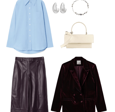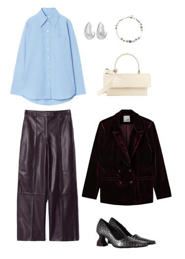 Bottom: Leather pants from & Other Stories create a striking texture contrast with the velvet blazer