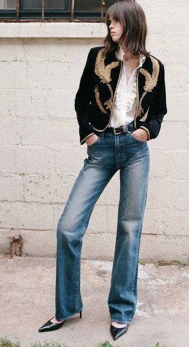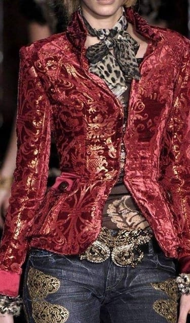 A velvet blazer paired with raw denim, an embroidered blouse combined with simple tailored pants, or a Baroque-patterned skirt balanced by a minimalist sweater all allow you to embrace this aesthetic while remaining elegant and effortlessly wearable every day.